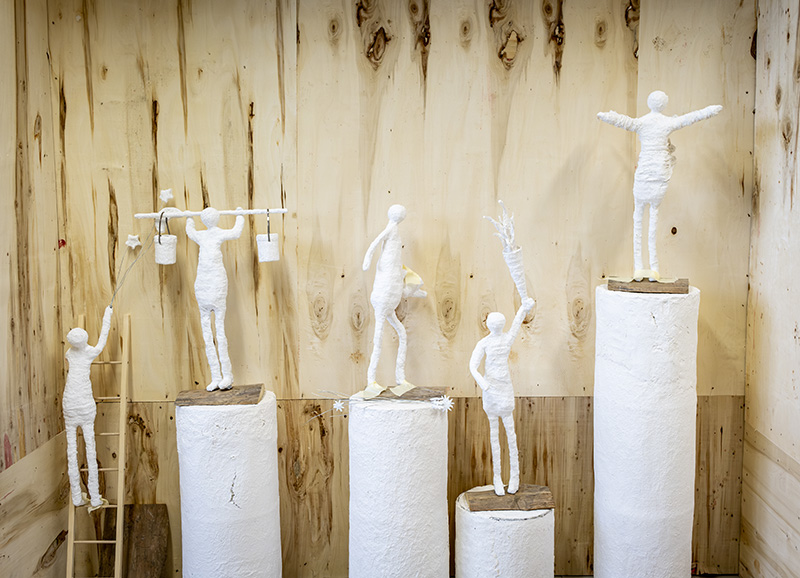 Op de ladder staan Zuster Maan en Zuster Sterre. Moeder Wind herken je aan haar waaiende gewaad. Broeder Vuur draagt de fakkel. Moeder Aarde bevrucht de grond en de bloemetjes met haar gieter en emmertjes water. “Ik kan me heel goed creatief uitleven met klei en gips. We hebben mannetjes gemaakt en bloemetjes”, vertelt Marinda, een van de gebruikers die het kunstwerk mee vormgaf. “Ik kan maar moeilijk met twee handen werken, dus Det houdt het voor mij vast en ik ga aan de slag. We zijn een goed team.”